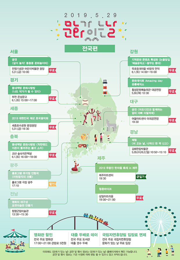 5월 ‘문화가 있는 날’인 오는 29일과 27일~6월 2일 해당 주간에는 전국에서 2211개 문화행사를 만날 수 있다.