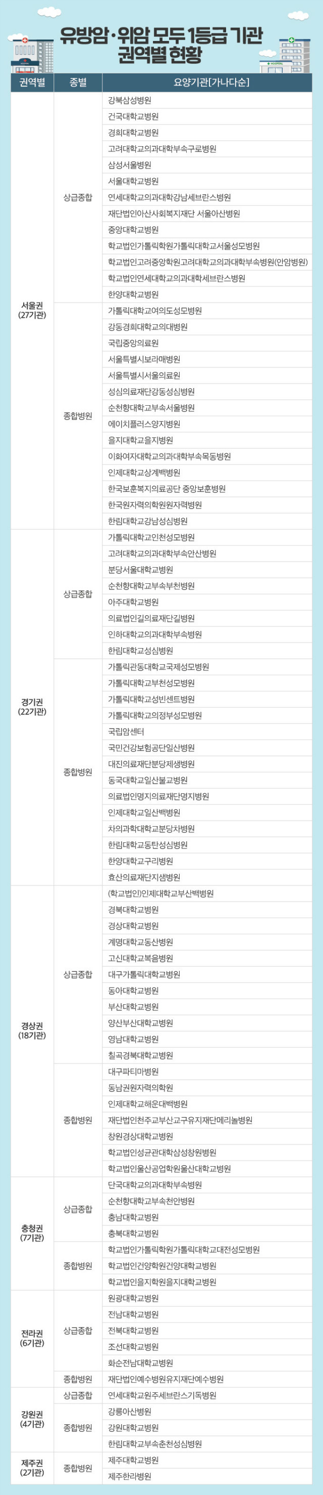 [일간환경연합 김경훈 기자]건강보험심사평가원은 ‘유방암·위암 적정성 평가’에서 유방암과 위암 모두 1등급을 받은 86개 기관(상급종합병원 42개·종합병원 44개)을 공개했다. 유방암·위암치료 모두 잘하는 1등급 병원이 전국에 고루 분포돼 암 치료 접근성 높은 것으로 나타났다.