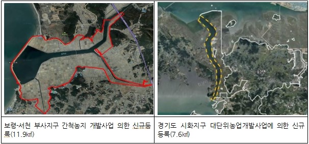 2019년 지적통계연보에 따르면, 작년 말 기준 전 국토의 지적공부 등록면적은 100,378㎢로 1년 동안 여의도 면적의 약 5배인 14㎢ 증가한 것으로 나타났으며 전라남도 영암군 관광레저형 기업도시 조성사업(8.4㎢) 및 경기도 시흥시 시화 멀티테크노밸리 조성사업(1.1㎢) 등 공유수면 매립에 따른 신규등록(새롭게 지적공부에 등록함)으로 인해 국토 면적이 증가한 것으로 조사되었다.
