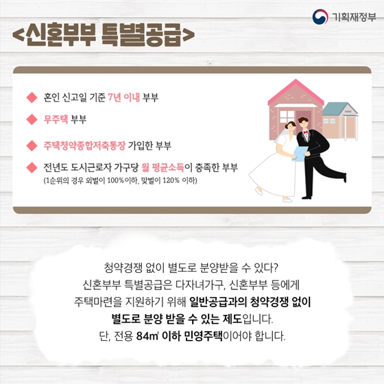<신혼부부 특별공급>청약경쟁 없이 별도로 분양받을 수 있다? 신혼부부 특별공급은 다자녀가구, 신혼부부 등에게 주택마련을 지원하기 위해 일반공급과의 청약경쟁 없이 별도로 분양받을 수 있는 제도입니다. 단, 전용 84㎡ 이하 민영주택이어야 합니다.
