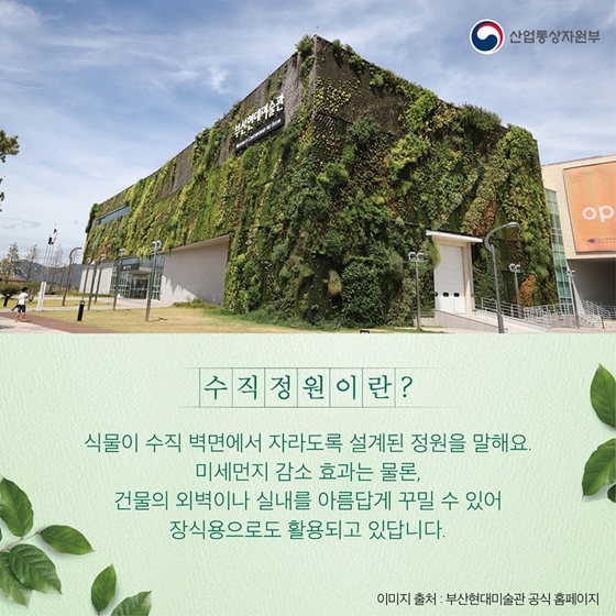 수직정원이란 식물이 수직 벽면에서 자라도록 설계된 정원을 말해요. 미세먼지 감소 효과는 물론 건물의 외벽이나 실내를 아름답게 꾸밀 수 있어 장식용으로도 활용되고 있답니다.
