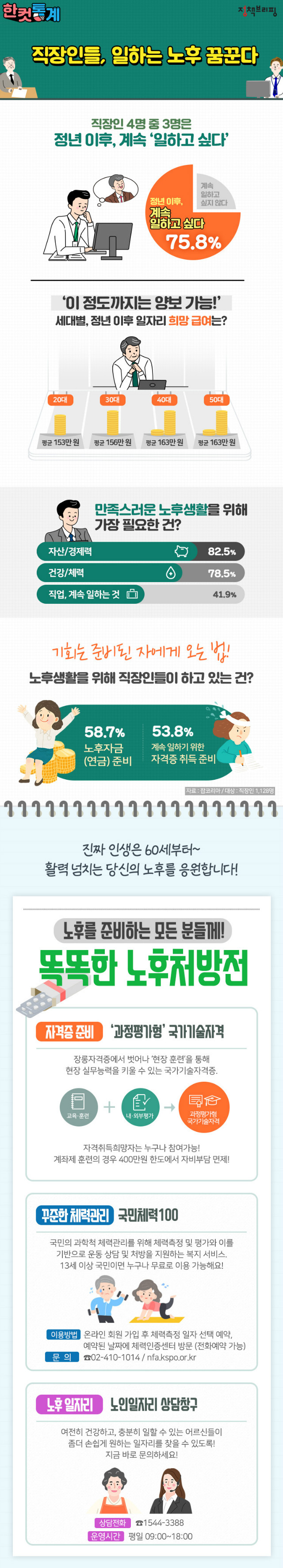 [일간환경연합 한선미 기자]일하는 노후를 꿈꾸는 직장인들! 잡코리아에서 직장인을 대상으로 설문조사를 실시한 결과, 직장인 4명 중 3명은 정년 이후, 계속 일하고 싶은 것으로 나타났어요.
