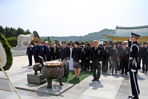 지난해 국립대전현충원에서 열린 현충일 추념식에서 문재인 대통령 내외와 주요내빈들이 현충탑에 헌화 및 분향을 하고 있다. |