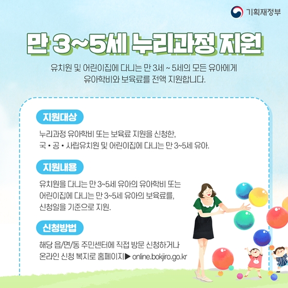 1.만 3~5세 누리과정 지원 유치원 및 어린이집에 다니는 만 3~5세의 모든 유아에게 유아학비와 보육료를 전액 지원합니다.