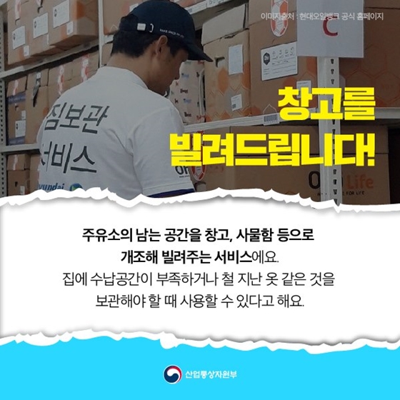 ◆ 창고를 빌려드립니다 주유소의 남는 공간을 창고, 사물함 등으로 개조해 빌려주는 서비스예요. 집에 수납공간이 부족하거나 철 지난 옷 같은 것을 보관해야 할 때 사용할 수 있어요.