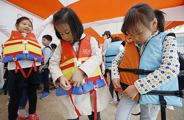 서울의 한 초등학교에서 열린 체험형 안전교육에서 어린이들이 구명조끼를 입어보고 있다.(사진=(c) 연합뉴스) |