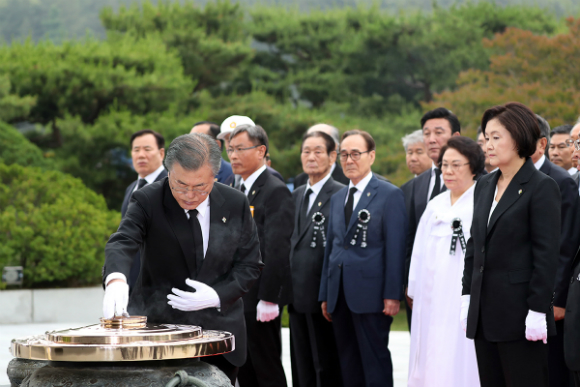문재인 대통령이 6일 오전 국립서울현충원에서 열린 제64회 현충일 추념식에서 분향하고 있다. (사진=청와대) |