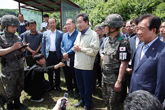 이낙연 국무총리가 주말인 8일 강원도 철원읍 관전리 소이산 삼거리 인근 민통선 내 육군 5사단 부대에서 아프리카돼지열병(ASF) 방역 추진상황을 보고받은 후 당부의 말을 하고 있다. (사진=(c) 연합뉴스) |
