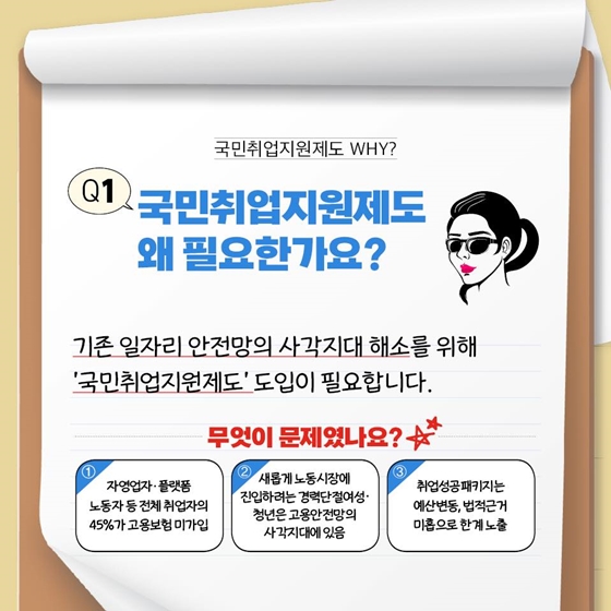 Q1. 국민취업지원제도 왜 필요한가요?기존 일자리 안전망의 사각지대 해소를 위해 ‘국민취업지원제도’ 도입이 필요합니다.