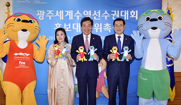 지난 2월 19일 열린 광주세계수영선수권대회 홍보대사 위촉식에서 이낙연 국무총리(정부 대표)와 오정해 씨(민간 대표)가 각각 홍보대사로 임명받은 후 기념촬영을 하고 있다. (사진=2019광주세계수영선수권대회 조직위원회) |