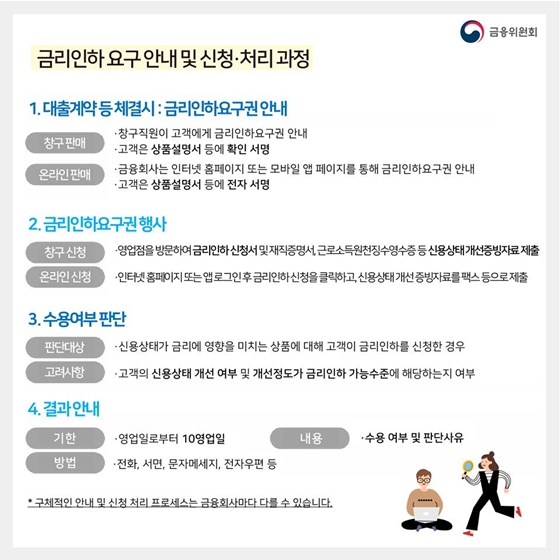 · 금융회사는 인터넷 홈페이지 또는 모바일 앱 페이지를 통해 금리인하요구권 안내