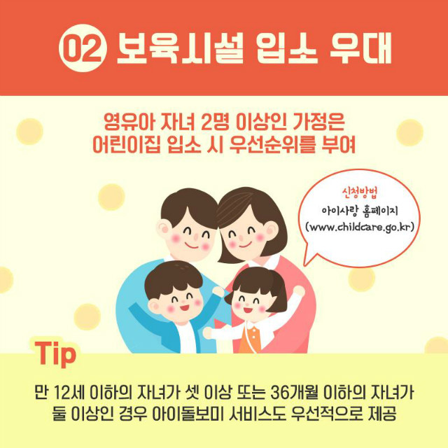 2. 보육시설 입소 우대 영유아 자녀 2명 이상인 가정은 어린이집 입소 시 우선순위를 부여