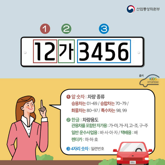 새 번호판에서는 앞 숫자가 3자리로 늘어나고, 태극문양, 국가축약문자(KOR), 위변조방지 홀로그램 등이 추가돼요. 반사 필름식이기 때문에 단속 카메라의 번호판 판독이 훨씬 수월하답니다. 사고 예방에 효율적이고, 위·변조 방지도 가능하다고 하네요!