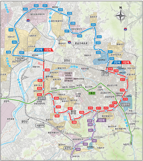 2단계 구간은 광주역에서 전남대, 수완지구를 거쳐 광주시청까지의 20km를 연결, 1단계와 순환망을 이루며 3단계 구간은 백운광장에서 진월을 거쳐 효천역을 잇는 4.8km의 지선으로 건설된다.