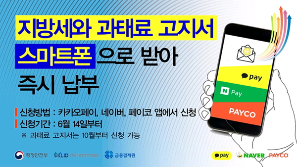 한편 ‘지방세 모바일 고지·납부제’의 본격 시행에 앞서 카카오페이, 네이버페이, 페이코 가입자를 대상으로 지방세 모바일 고지서 신청안내를 실시한다.