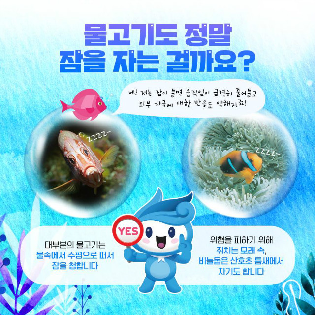 물고기도 정말 잠을 자는 걸까요? 물고기는 잠이 들면 움직임이 급격히 줄어들고 외부 자극에 대한 반응도 약해지죠! 대부분의 물고기는 물속에서 수평으로 떠서 잠을 청합니다. 위협을 피하기 위해 쥐치는 모래 속, 비늘돔은 산호초 틈새에서 자기도 합니다.