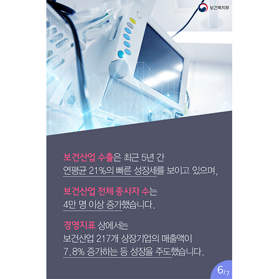 보건산업 수출은 최근 5년간 연평균 21%의 빠른 성장세를 보이고 있으며, 보건산업 전체 종사자 수는 4만 명 이상 증가했습니다. 경영지표 상에서는 보건산업 217개 상장기업의 매출액이 7.8% 증가하는 등 성장을 주도했습니다.