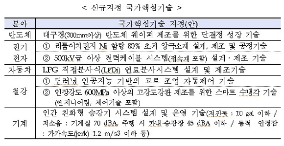 산업통상자원부는 20일 산업기술보호위원회를 열고 500kV급 전력케이블 기술과 ▲반도체 대구경 웨이퍼 제조기술 ▲이차전지 양극소재 기술 ▲LPG차 직접분사 기술 ▲인공지능 고로조업 기술 ▲철강 스마트 수냉각 기술 ▲저진동·저소음 승강기 기술 등을 국가 핵심기술로 지정했다고 밝혔다.