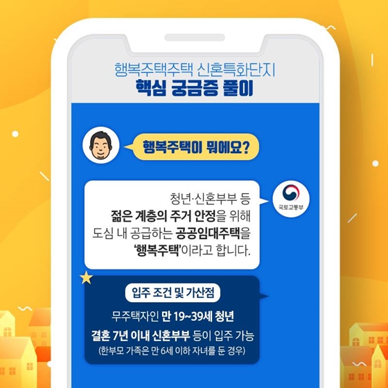 Q. 행복 주택이 뭐예요?A. 청년·신혼부부 등 젊은 계층의 주거 안정을 위해 도심 내 공급하는 공공임대주택을 ‘행복주택’이라고 합니다.