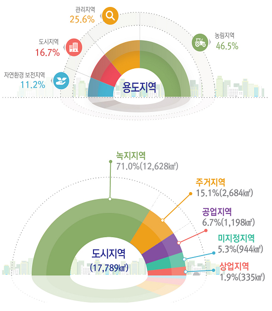 전체 국토 면적에서 각 용도지역이 차지하는 비중은 ▲도시지역 16.7% ▲관리지역 25.6% ▲농림지역 46.5% ▲자연환경보전지역 11.2%였다.