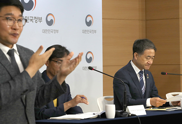 박능후 보건복지부 장관이 25일 정부서울청사에서 열린 ‘장애인 지원체계 개편 브리핑’에서 발언하고 있다. 옆에는 수화통역사가 브리핑 내용을 수화로 설명 중이다.(사진=(c) 연합뉴스) |