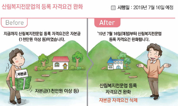 ▲ 산림복지전문업의 등록 자격요건 완화 = 지금까지 산림복지전문업을 등록하고자 하는 자는 산림치유업, 숲해설업, 유아숲교육업, 숲길등산 지도업, 종합산림복지업에 따라 1천만원 이상 또는 3천만원 이상의 자본금을 확보해야 했으나 앞으로는 자본금 조건이 삭제된다. 개정내용은 현재 법제처 심사 중으로 7월 16일부터 적용될 예정이다.