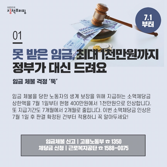 01. 못 받은 임금, 최대 1천만원까지 정부가 대신 드려요 임금 체불을 당한 노동자의 생계 보장을 위해 지급하는 소액체당금 상한액을 7월 1일부터 현행 400만원에서 1천만원으로 인상합니다. 또 지급기간도 7개월에서 2개월로 줄입니다. 이번 소액체당금 인상은 7월 1일 후 판결 확정된 건부터 적용하니 꼭 알아두세요!