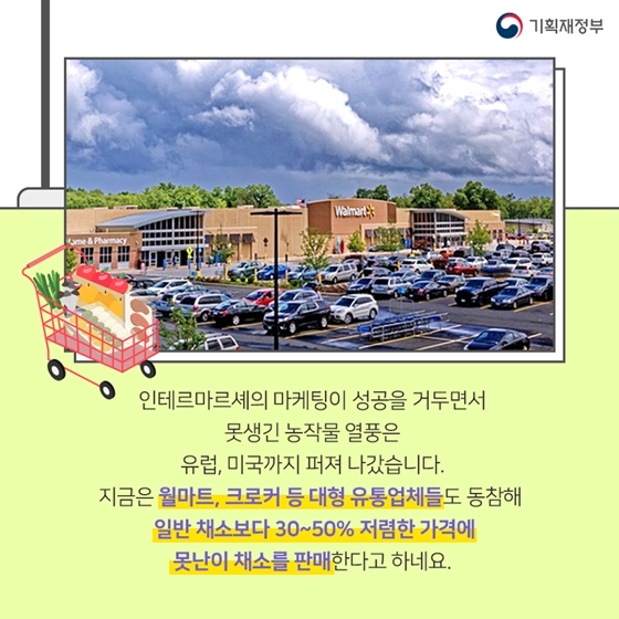 인테르마르셰의 마케팅이 성공을 거두면서 못생긴 농작물 열풍은 유럽, 미국까지 퍼져 나갔습니다. 지금은 월마트, 크로커 등 대형 유통업체들도 동참해 일반 채소보다 30~50% 저렴한 가격에 못난이 채소를 판매한다고 하네요.
