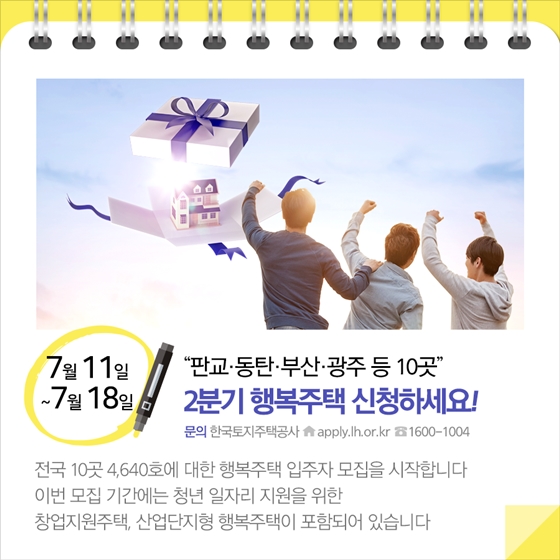 ◆ “판교·동탄·부산·광주 등 10곳”…2분기 행복주택 신청하세요!(7.11~18)전국 10곳 4,640호에 대한 행복주택 입주자 모집을 시작합니다. 이번 모집 기간에는 청년 일자리 지원을 위한 창업지원주택, 산업단지형 행복주택이 포함되어 있습니다.