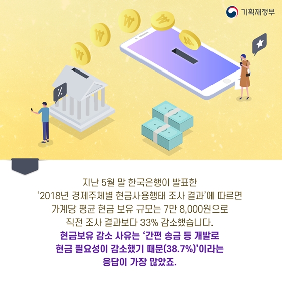 지난 5월 말 한국은행이 발표한 ‘2018년 경제주체별 현금사용행태 조사 결과’에 따르면 가계당 평균 현금 보유 규모는 7만 8,000원으로 직전 조사 결과보다 33% 감소했습니다. 현금보유 감소 사유는 ‘간편 송금 등 개발로 현금 필요성이 감소했기 때문(38.7%)’이라는 응답이 가장 많았죠.