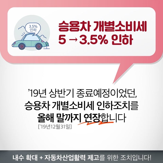 2019년 상반기 종료 예정이었던 승용차 개별소비세 인하조치를 올해 말까지 연장합니다. 내수 확대+자동차산업활력 제고를 위한 조치입니다.