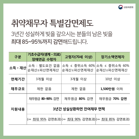 [일간환경연합 장민주 기자]오는 8일부터 취약계층이 3년간 성실히 빚을 갚으면 남은 채무를 최대 95%까지 감면해주는 제도가 시행됩니다.