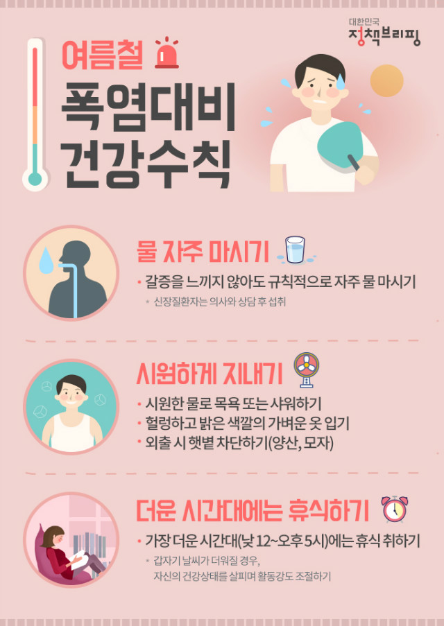 무더위가 지속되는 여름철에는 항상 기상상황에 주목하고, 더위로 인해 발생할 수 있는 온열질환(열사병, 열탈진, 열경련, 열실신, 열부종, 열발진 등)이 발생할 수 있으니 평소에 질환별 주요증상을 알고 응급처치 방법을 사전에 익혀두는 것이 중요하다.