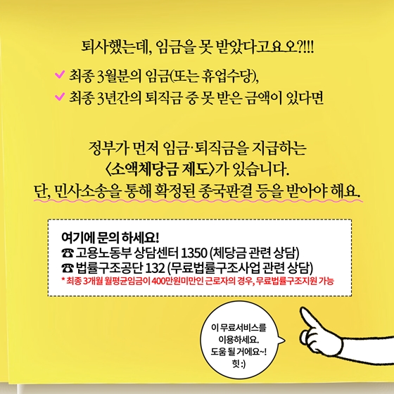 퇴사했는데, 임금을 못 받았다고요?최종 3월분의 임금(또는 휴업수당), 최종 3년간의 퇴직금 중 못 받은 금액이 있다면 정부가 먼저 임금·퇴직금을 지급하는 <소액체당금 제도>가 있습니다. 단, 민사소송을 통해 확정된 종국 판결 등을 받아야 해요.