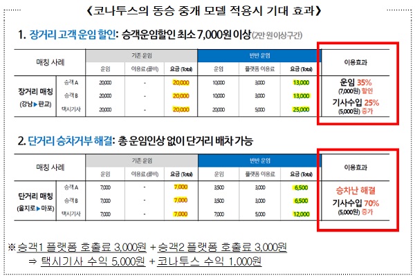 이 서비스로 앱을 이용한 안전한 자발적 동승이 허용되면 심야시간대 승차난 해소가 가능하며 이용자의 택시비 절감, 택시기사의 수입 증대에 기여할 수 있을 것으로 기대된다.