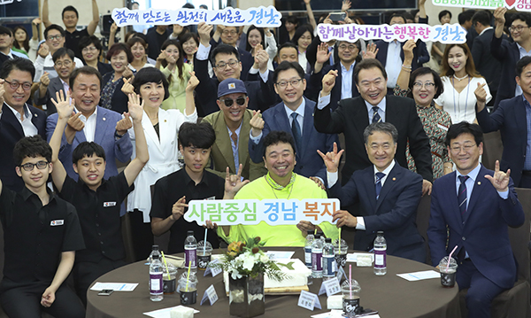 박능후 보건복지부 장관(오른쪽 두번째)과 가수 강원래, 김경수 경남지사(둘째줄 왼쪽 다섯번째) 등이 경상남도 사회서비스원 개원을 축하하고 있다. (사진=보건복지부 제공) |