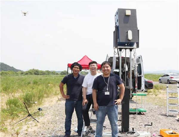 DGSIT 협동로봇융합연구센터 오대건 연구원팀이 인근 무인비행시험장에서 레이더탐지 시연을 마친 후 기념촬영을 하고 있다. 오른쪽부터 오대건 선임연구원, 김문현 연구원, 최병길 연구원. |
