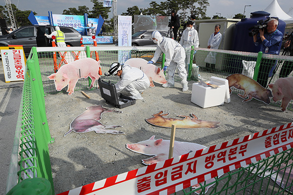 지난 4월 30일 세종시 세종호수공원 제2주차장에서 열린 ‘아프리카돼지열병(ASF) 가상방역훈련’에서 가축방역관이 간이 검사와 시료채취 훈련을 하고 있다.(사진=(c) 연합뉴스) |