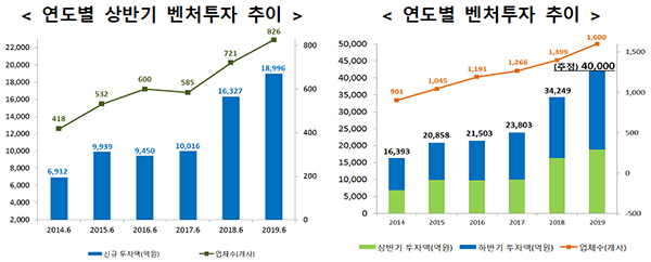 중소벤처기업부와 한국벤처캐피탈협회가 18일 발표한 ‘2019년 상반기 벤처투자 동향’에 따르면 올해 상반기 벤처 투자액은 지난해 같은 기간의 1조 6327억원보다 16.3% 증가한 1조 8996억원으로 집계됐다. 상반기 기준으로 사상 최고치다.