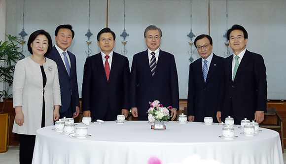 문재인 대통령이 18일 오후 청와대에서 열린 ‘정당대표 초청 대화’에 앞서 열린 차담회에서 여야 5당 대표와 포즈를 취하고 있다. 왼쪽부터 정의당 심상정 대표, 바른미래당 손학규 대표, 자유한국당 황교안 대표, 문 대통령, 더불어민주당 이해찬 대표, 민주평화당 정동영 대표. (사진=(c) 연합뉴스) |