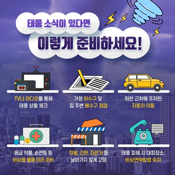만일의 사태를 대비하기 위해 응급 약품과 손전등 같은 비상용품을 미리 준비하는 것이 좋습니다. 지붕, 간판, 자전거 등이 날아가지 않게 단단히 고정해주세요!