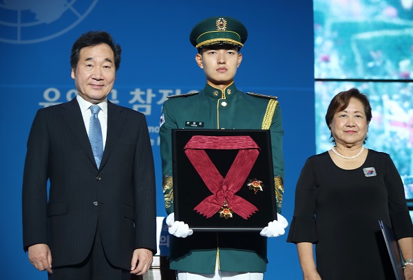 이낙연 국무총리가 지난해 서울 동대문디자인플라자에서 열린 6·25전쟁 유엔군 참전의 날 기념식에 참석해 필리핀 참전용사 고 콘라도 디 얍의 딸 이사벨리타 얍 씨에게 태극무공훈장 수여 후 기념촬영을 하고 있다.(사진=(c) 연합뉴스) |