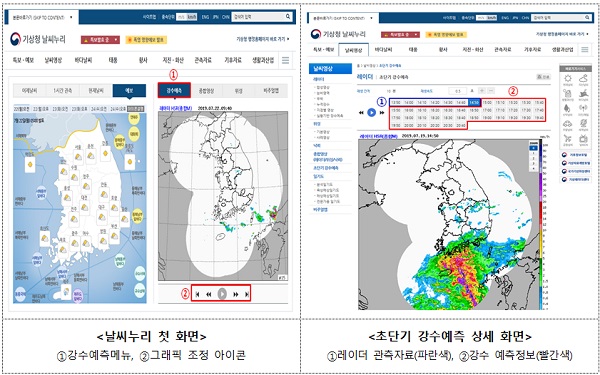 초단기 강수예측정보는 기상청 날씨누리(http://http://www.weather.go.kr)와 모바일 웹에서 이용 할 수 있다. 날씨누리 첫 화면의 영상 부분과 ‘날씨영상 > 초단기 강수예측’에서 확인할 수 있다.