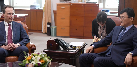 윤순구 외교부 차관보가 23일 오후 서울 종로구 외교부에서 막심 볼코프 주한 러시아 대사대리를 초치해 러시아 군용기의 독도 영공 침범에 대해 항의하고 있다. ((c) 연합뉴스) |