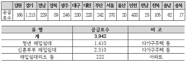 올해 세 번째 매입임대주택 모집 물량은 3942가구로 청년(19∼39세)에 1410가구, 신혼부부(예비 신혼부부·한부모 가족 포함)에 2310가구가 공급된다.