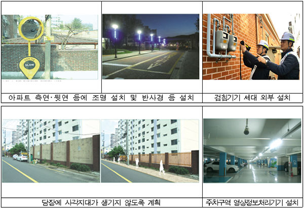 예를 들면 아파트 측면이나 뒷면 등에 조명시설을 설치하고 전기·가스·수도 등의 검침기기는 세대 외부에 설치하는 등의 방법으로 범죄 가능성을 낮추는 것이다.