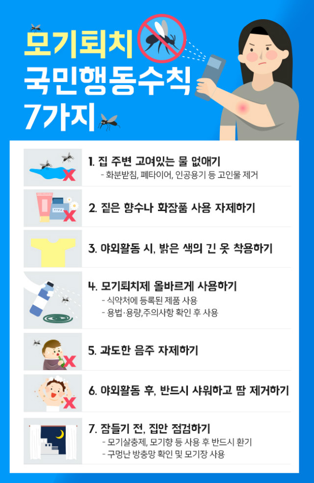 둘째, 노출된 피부나 옷, 신발상단, 양말 등에 모기 기피제를 사용하고, 야외 활동 시 모기를 유인할 수 있는 진한 향수나 화장품 사용은 자제하는 것이 좋다.