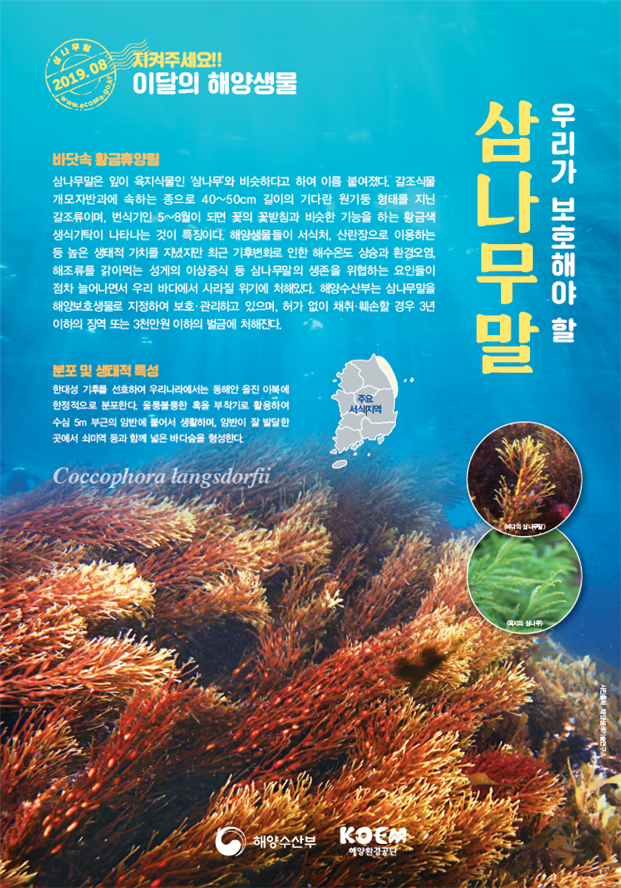 삼나무말을 비롯한 해양보호생물에 관한 자세한 정보는 바다생태정보나라 누리집(www.ecosea.go.kr)에서 확인할 수 있다.