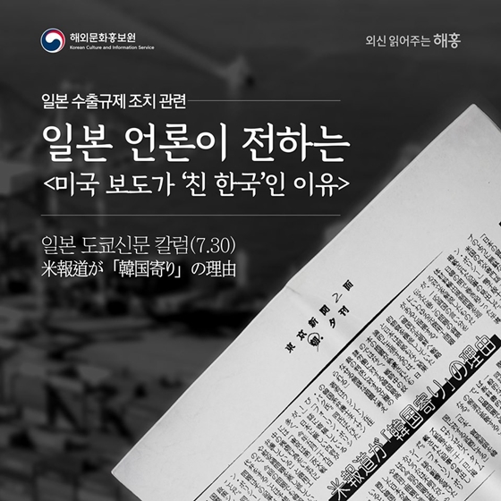 일본 수출규제 조치와 관련,미국의 외교전문지 포린폴리시(Foreign Policy)에 실린 기고에 주목한 것입니다. 자세한 내용을 해외문화홍보원에서 알려드립니다.