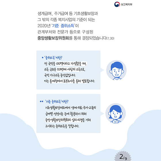 2020년 ‘기준 중위소득’은 올해보다 2.94% 올랐습니다. 또한 기준 중위소득 상승과 함께 주거급여, 교육급여 등의 선정기준이 인상되어 더욱 많은 분들이 혜택을 받을 수 있게 되었습니다.